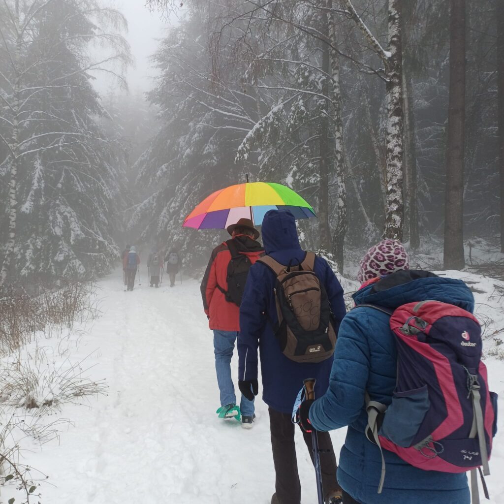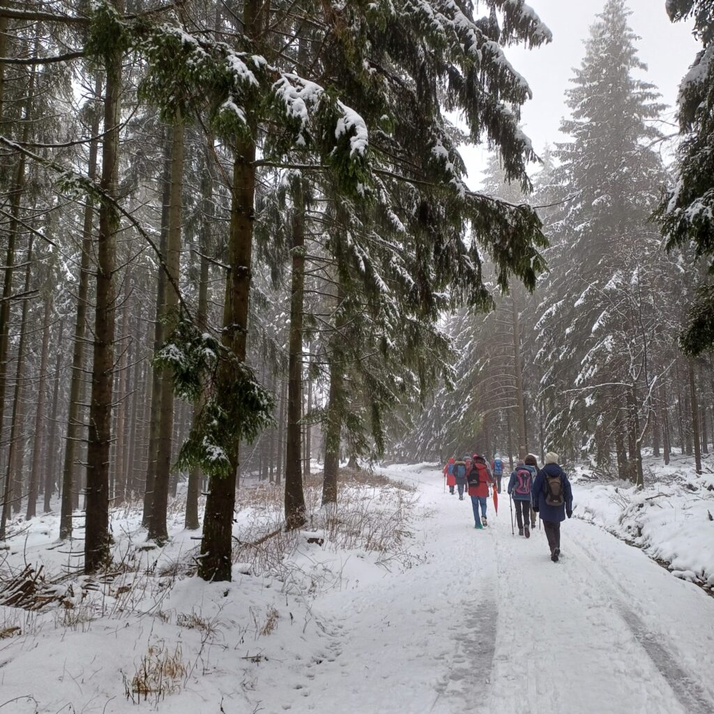 Dieses Jahr werden wir vom Winter verwöhnt. Auch auf unserer Monatswanderung im Februar, die uns auf die Höhen des Taunus führte, herrschten winterliche Bedingungen. Schnee, Eis und Nebel forderten Trittsicherheit und Orientierungsvermögen. Da gab es unter unseren Teilnehmern durchaus kreativen Lösungsansätze. Die Mittagseinkehr am Herzberg war wunderbar, die Speisen lecker und eine Stimmung/Trubel wie auf einer Skihütte in den Alpen. Ein tolles Wintererlebnis – da waren sich zum Schluss der Tour alle einig. (Lenore Hinkel).