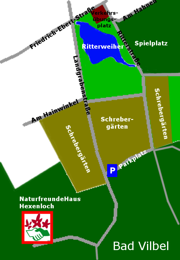 Das NaturFreundeHaus Hexenloch erreicht man in Verlängerung der Landgrabenstraße. Der Weg geht durch die Kleingartenanlage hindurch, an einer Wiese entlang und dann folgt man dem Hinweisschild nach rechts. Bevor der Weg steil in den Wald hinaufführt, biegt man rechts ab und gelangt so zum Naturfreundegelände.